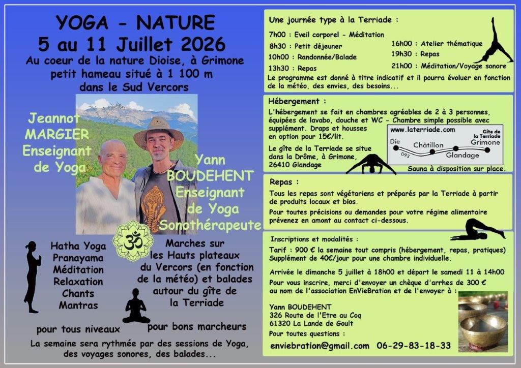 Réveil corporel, pranayama, puis pause petit déjeuner jusqu’à 10h Hatha-yoga, postures en duo Chants et yoga-nidra ; yoga sur chaise et pratique dans la nature |